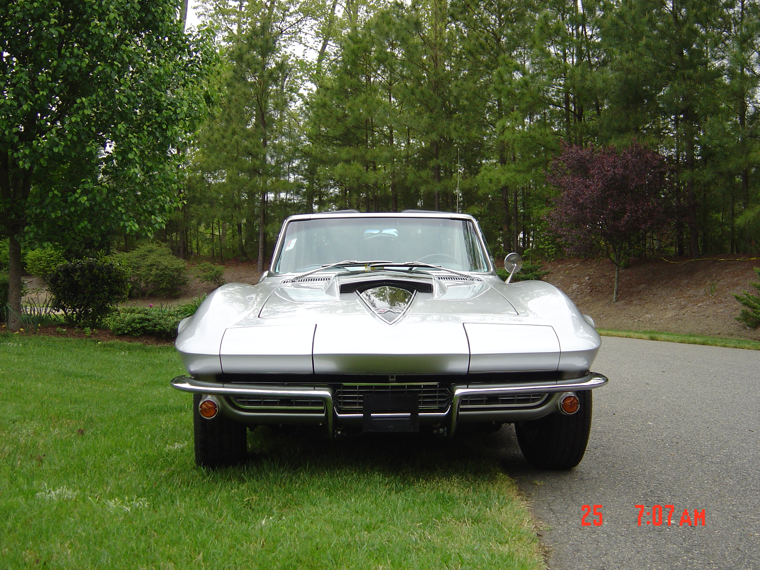 Back in the day, I had the privilege of owning several classic Corvettes. To celebrate the publication of Corvette Nightfire in April (it is the name of the novel’s main character), every so often I am going to share some photos and stories of these incredible cars. A couple of the cars had histories worthy of novels. This silver convertible is a ’66 big block Sting Ray with a 427 engine. Note the side pipes. For purists, yes, that is a ’67 stinger hood. This car literally shook the ground when it started, and I am not kidding. I drove it a few times between Williamsburg and Colonial Heights along Rt. 5 during the summertime. Something about this beauty really brought out the All American waves and thumbs up. I didn’t know as much about the history of this Corvette as some of the others. I just knew it was scary-fast. It was never a ride; it was always an experience. I ended up selling it to a man in Florida. Good place for a car like this. Look at a head-on photo and you will understand why the design of the car led it to being called the Sting Ray.
